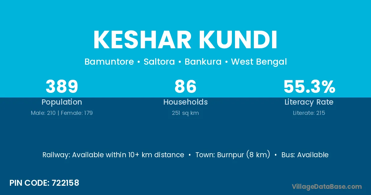 Burnpur (8 km) is the nearest town to Keshar Kundi village for major economic activities and is located approximately 8 km away.