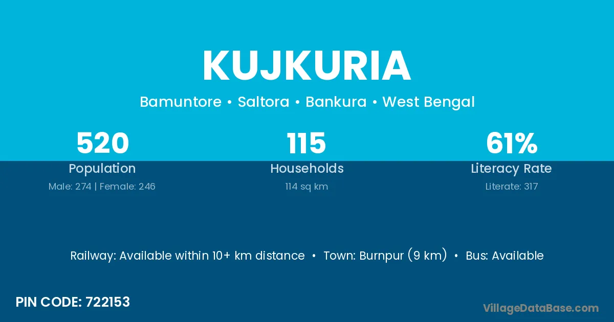 Burnpur (9 km) is the nearest town to Kujkuria village for major economic activities and is located approximately 9 km away.