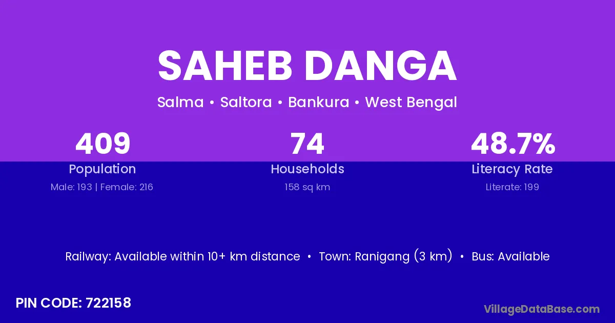 Ranigang (3 km) is the nearest town to Saheb Danga village for major economic activities and is located approximately 3 km away.