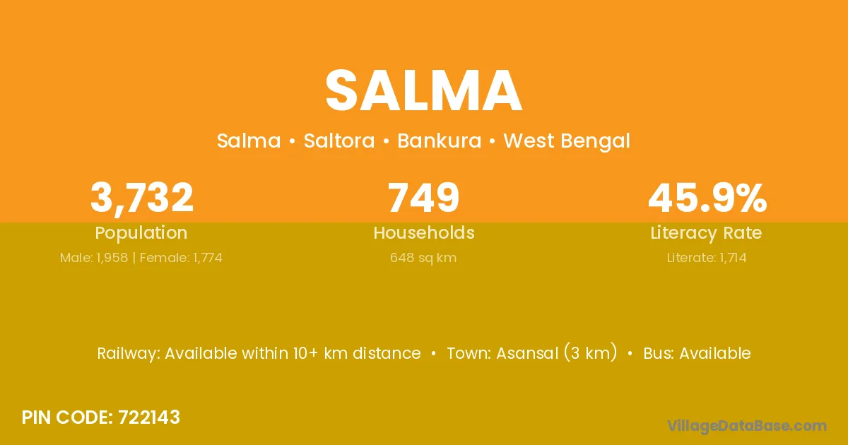 Asansal (3 km) is the nearest town to Salma village for major economic activities and is located approximately 3 km away.