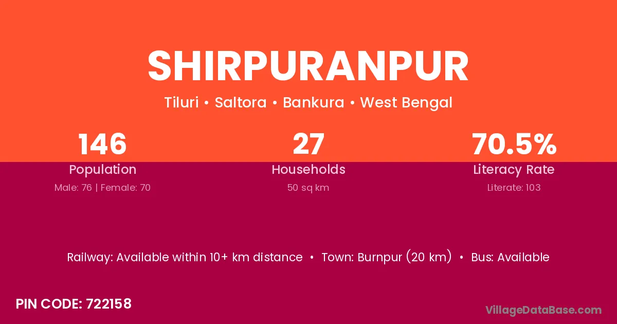 Burnpur (20 km) is the nearest town to Shirpuranpur village for major economic activities and is located approximately 20 km away.