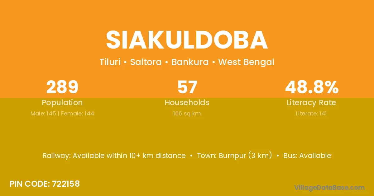 Burnpur (3 km) is the nearest town to Siakuldoba village for major economic activities and is located approximately 3 km away.