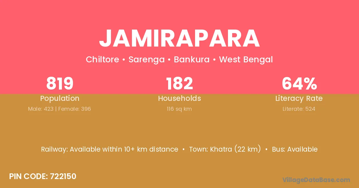 Khatra (22 km) is the nearest town to Jamirapara village for major economic activities and is located approximately 22 km away.