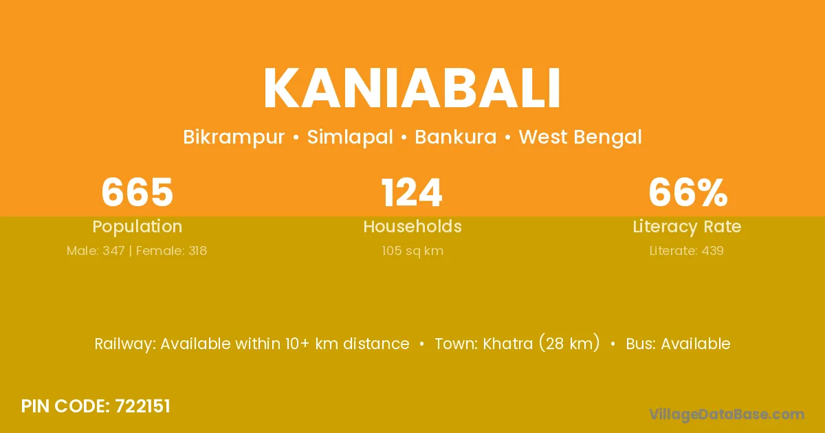 Khatra (28 km) is the nearest town to Kaniabali village for major economic activities and is located approximately 28 km away.