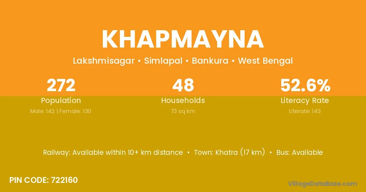 Khatra (17 km) is the nearest town to Khapmayna village for major economic activities and is located approximately 17 km away.
