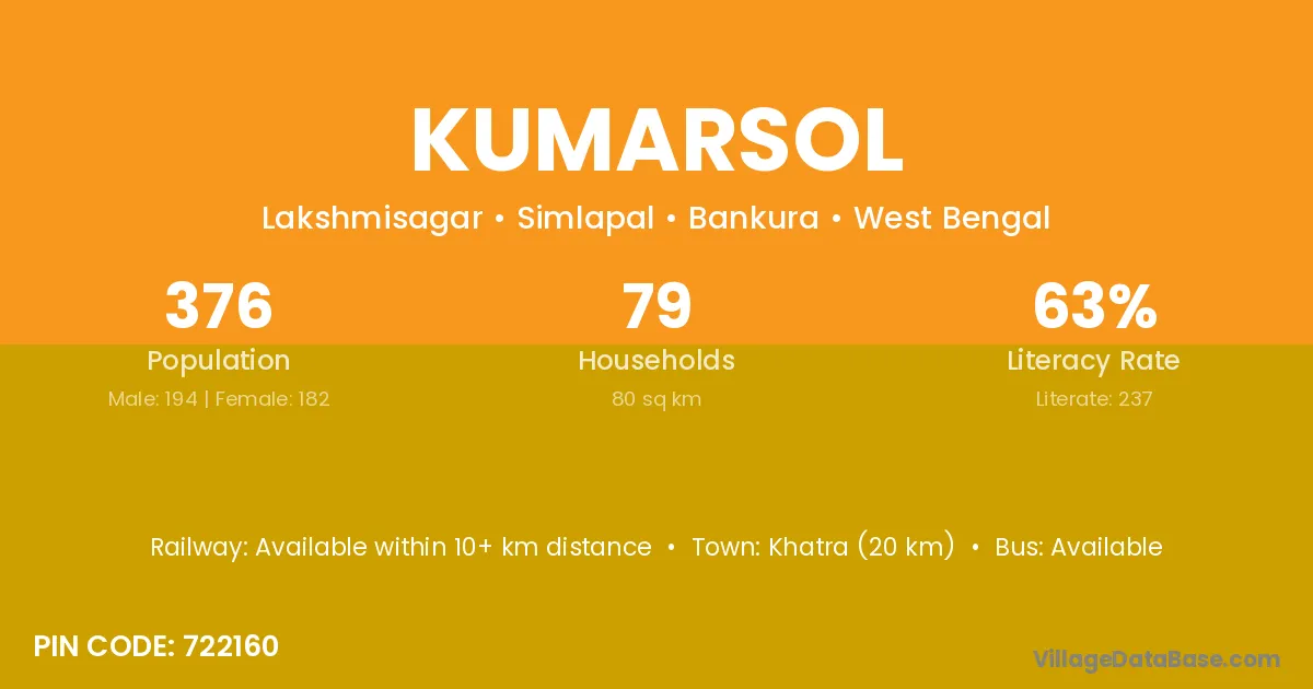 Khatra (20 km) is the nearest town to Kumarsol village for major economic activities and is located approximately 20 km away.