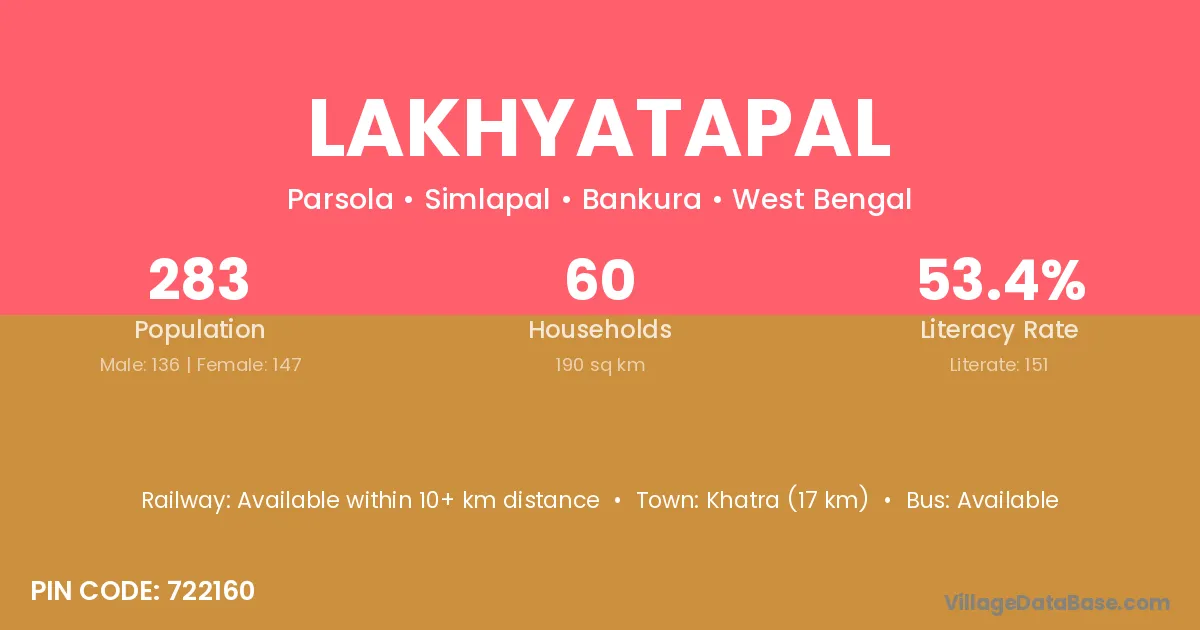 Khatra (17 km) is the nearest town to Lakhyatapal village for major economic activities and is located approximately 17 km away.