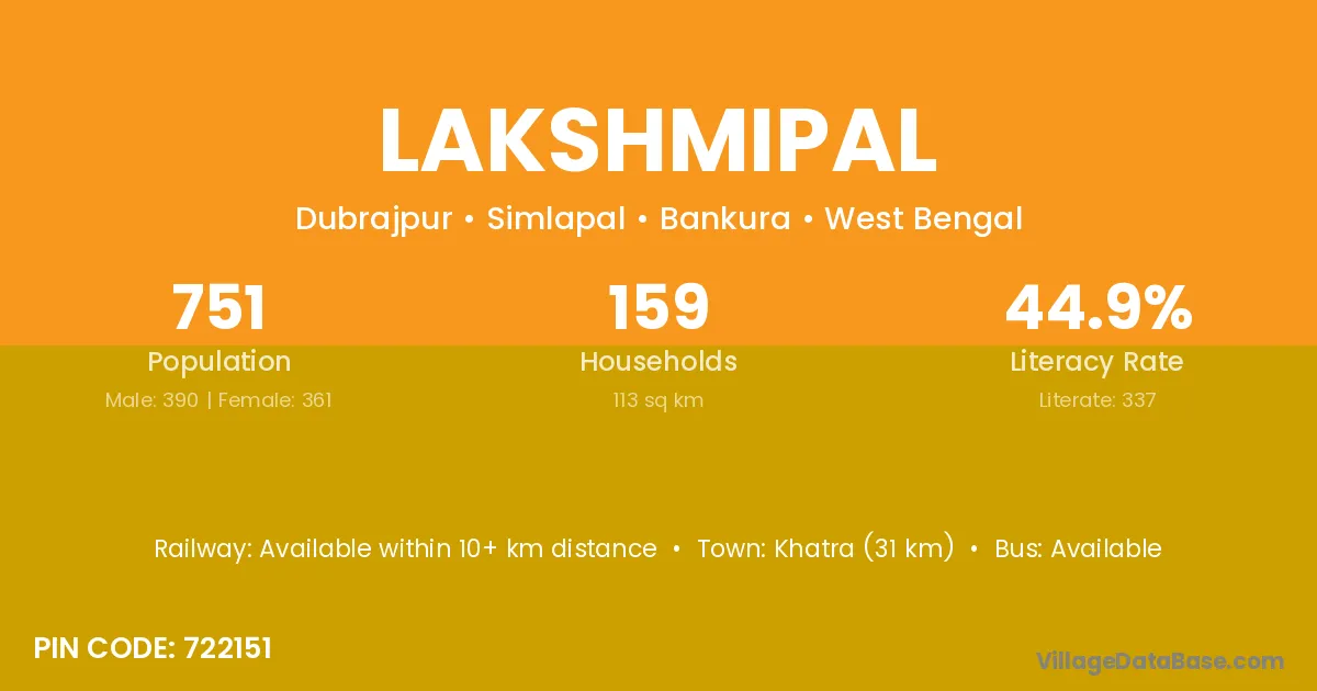 Khatra (31 km) is the nearest town to Lakshmipal village for major economic activities and is located approximately 31 km away.