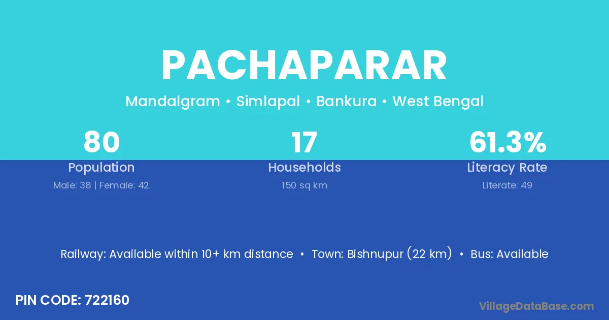 Bishnupur (22 km) is the nearest town to Pachaparar village for major economic activities and is located approximately 22 km away.