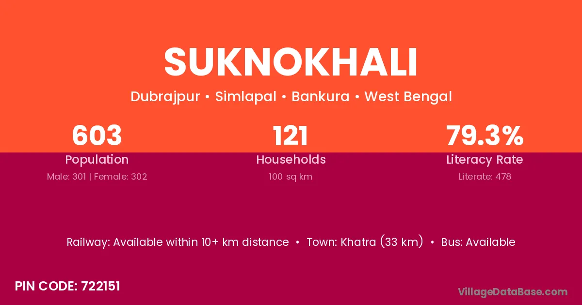 Khatra (33 km) is the nearest town to Suknokhali village for major economic activities and is located approximately 33 km away.