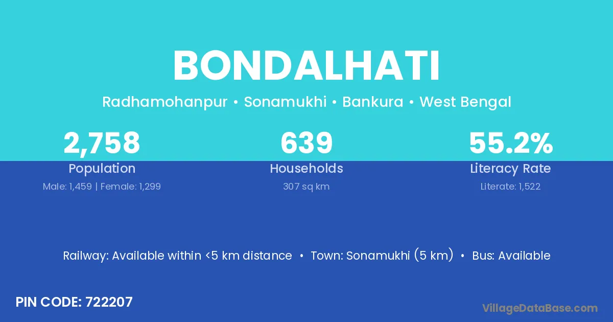 Sonamukhi (5 km) is the nearest town to Bondalhati village for major economic activities and is located approximately 5 km away.