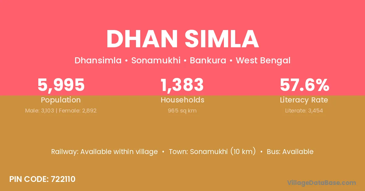 Sonamukhi (10 km) is the nearest town to Dhan Simla village for major economic activities and is located approximately 10 km away.
