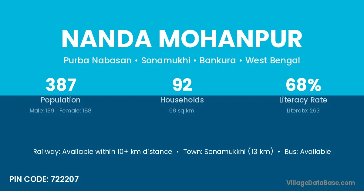 Nanda Mohanpur village has a total population of 387 people, of which 199 are males and 188 are females.