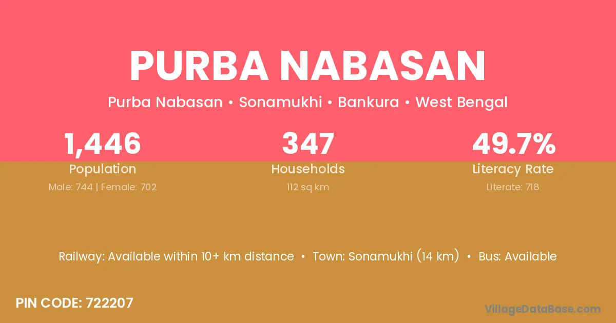 Sonamukhi (14 km) is the nearest town to Purba Nabasan village for major economic activities and is located approximately 14 km away.