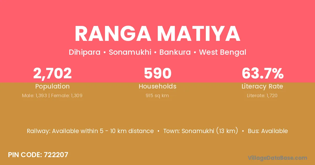 Sonamukhi (13 km) is the nearest town to Ranga Matiya village for major economic activities and is located approximately 13 km away.