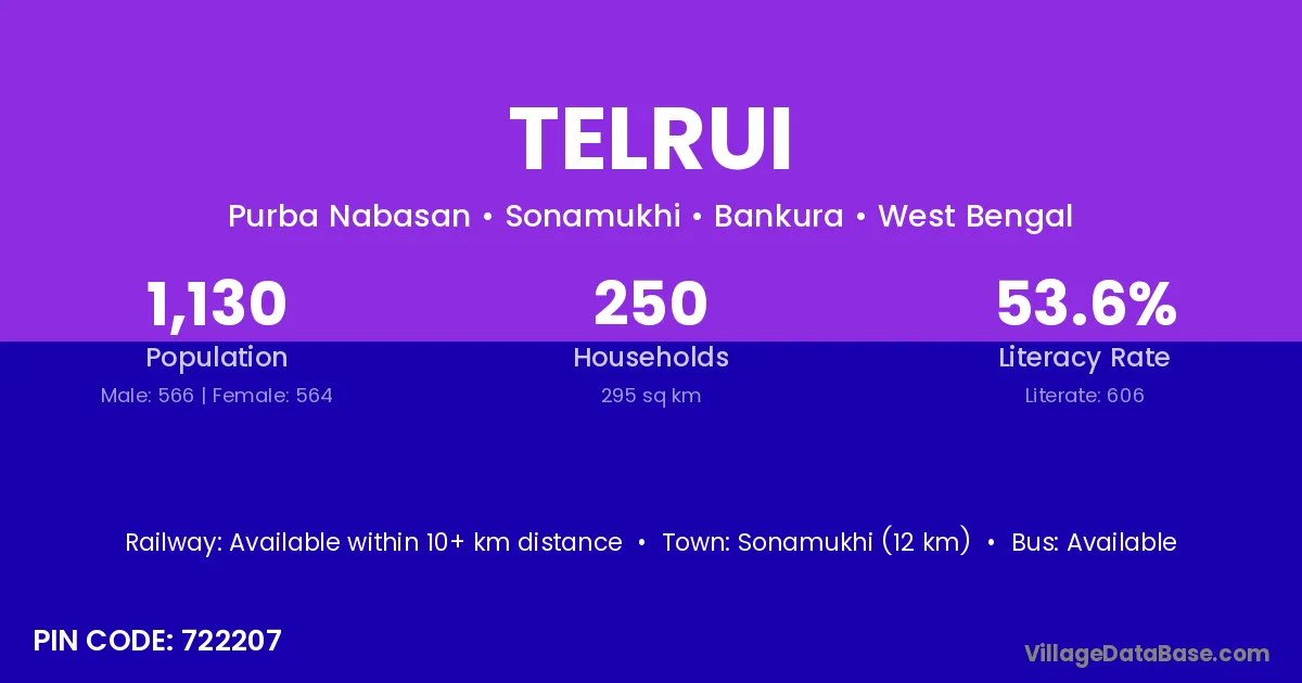 Sonamukhi (12 km) is the nearest town to Telrui village for major economic activities and is located approximately 12 km away.