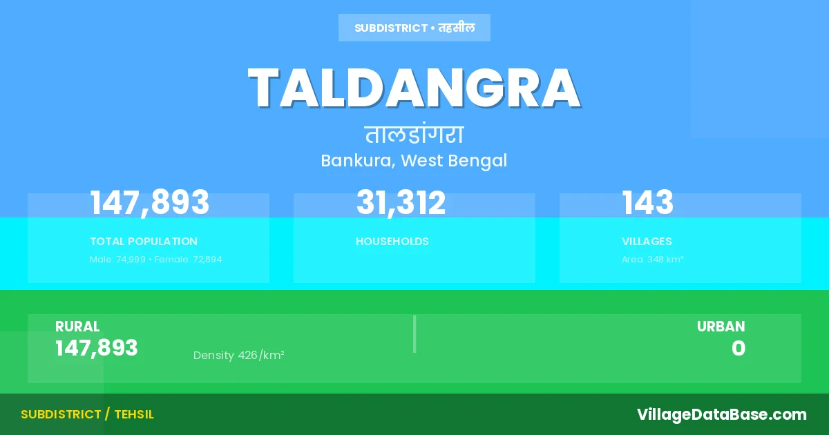 According to the 2011 census The total area of Taldangra Subdivision is 348 km², with a population of 147893 people. The population density is 426 inhabitants per square kilometre, and there are approximately 31312 houses in the sub district.