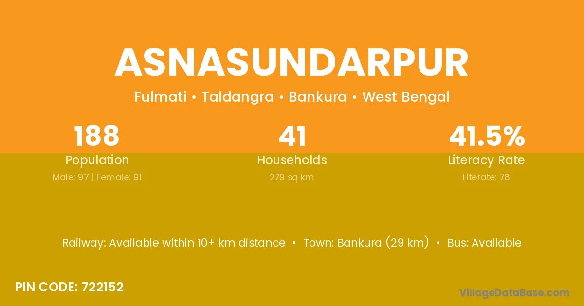 Bankura (29 km) is the nearest town to Asnasundarpur village for major economic activities and is located approximately 29 km away.