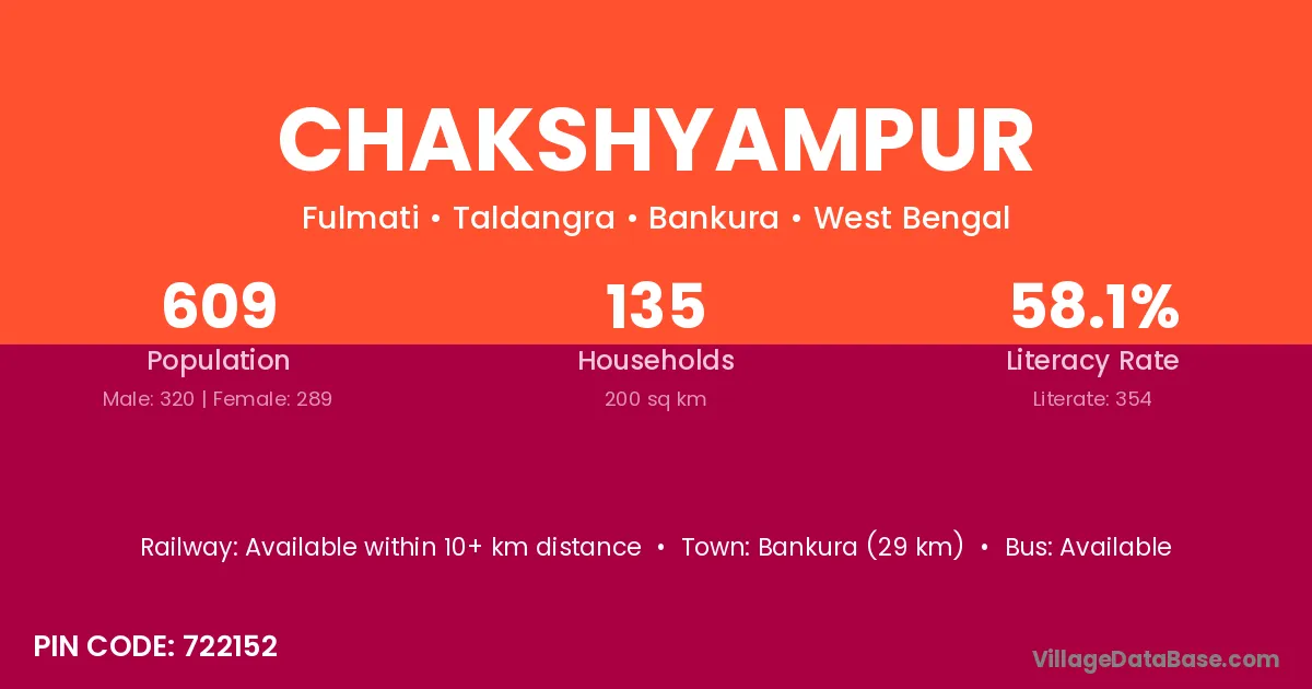 Bankura (29 km) is the nearest town to Chakshyampur village for major economic activities and is located approximately 29 km away.