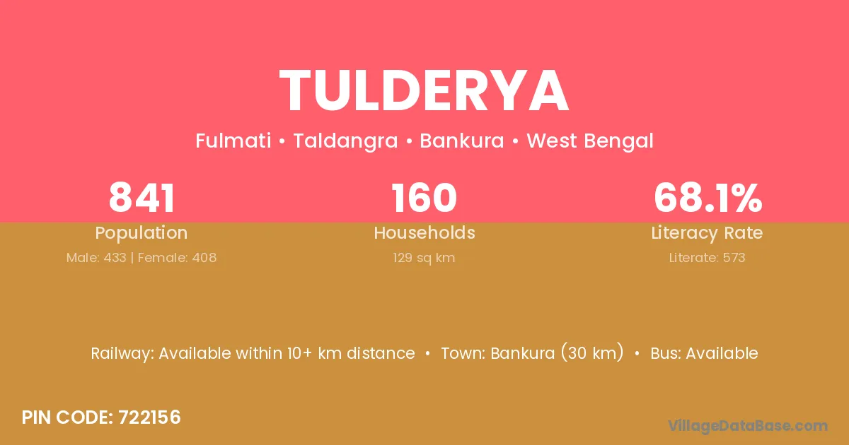 Bankura (30 km) is the nearest town to Tulderya village for major economic activities and is located approximately 30 km away.