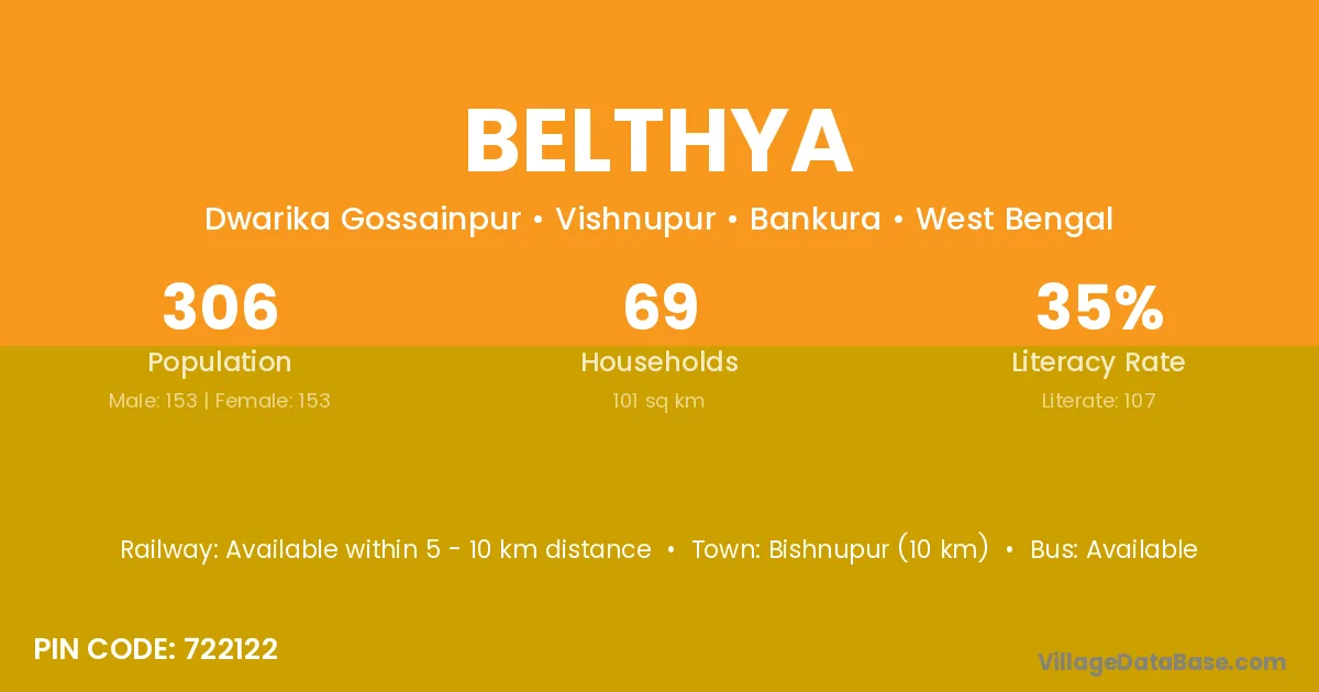 Bishnupur (10 km) is the nearest town to Belthya village for major economic activities and is located approximately 10 km away.