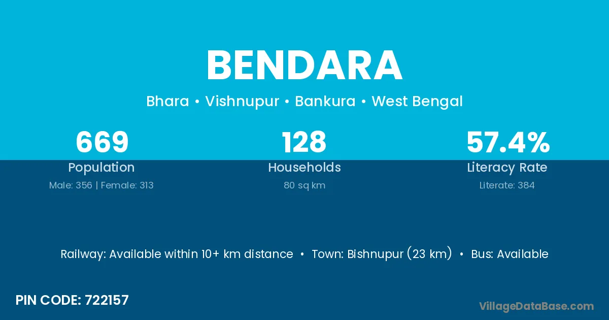 Bishnupur (23 km) is the nearest town to Bendara village for major economic activities and is located approximately 23 km away.