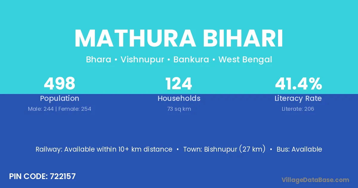 Bishnupur (27 km) is the nearest town to Mathura Bihari village for major economic activities and is located approximately 27 km away.