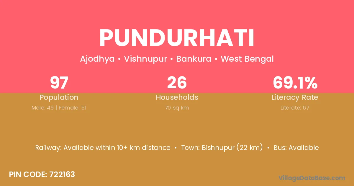 Bishnupur (22 km) is the nearest town to Pundurhati village for major economic activities and is located approximately 22 km away.