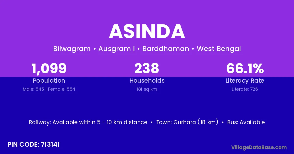 Gurhara (18 km) is the nearest town to Asinda village for major economic activities and is located approximately 18 km away.