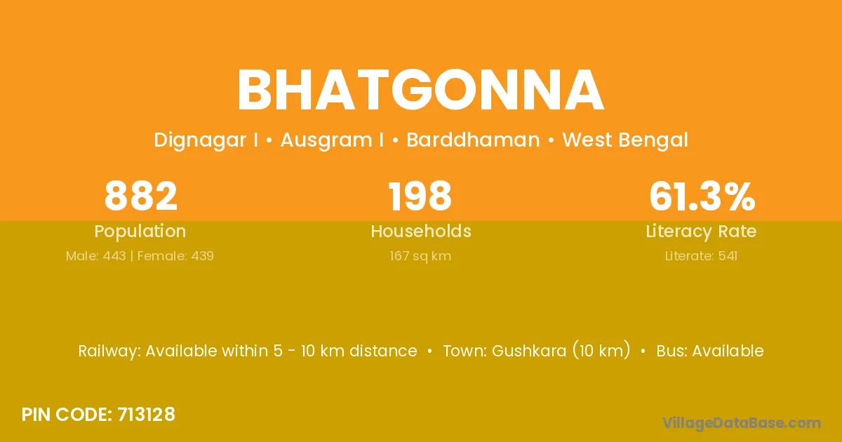 Bhatgonna village has a total population of 882 people, of which 443 are males and 439 are females.