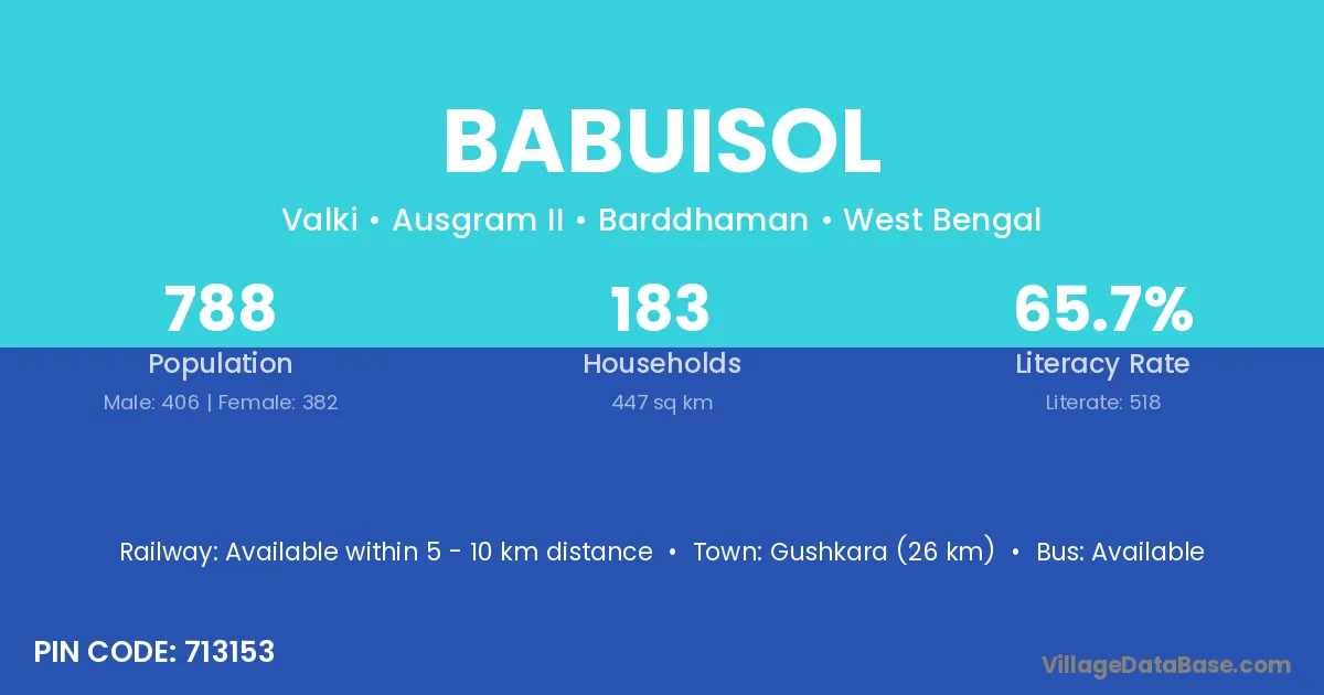 Gushkara (26 km) is the nearest town to Babuisol village for major economic activities and is located approximately 26 km away.