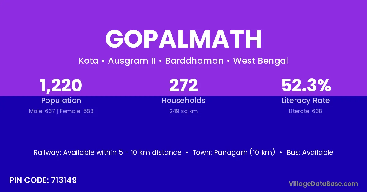 Panagarh (10 km) is the nearest town to Gopalmath village for major economic activities and is located approximately 10 km away.