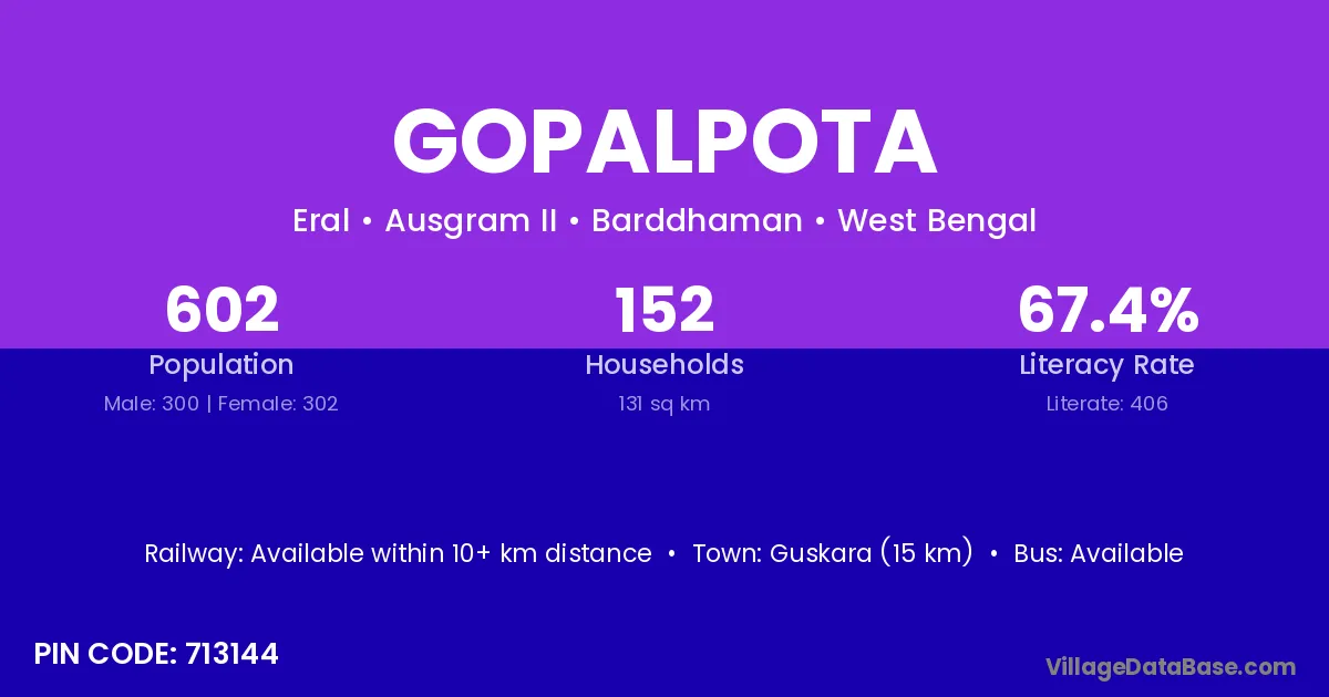 Guskara (15 km) is the nearest town to Gopalpota village for major economic activities and is located approximately 15 km away.
