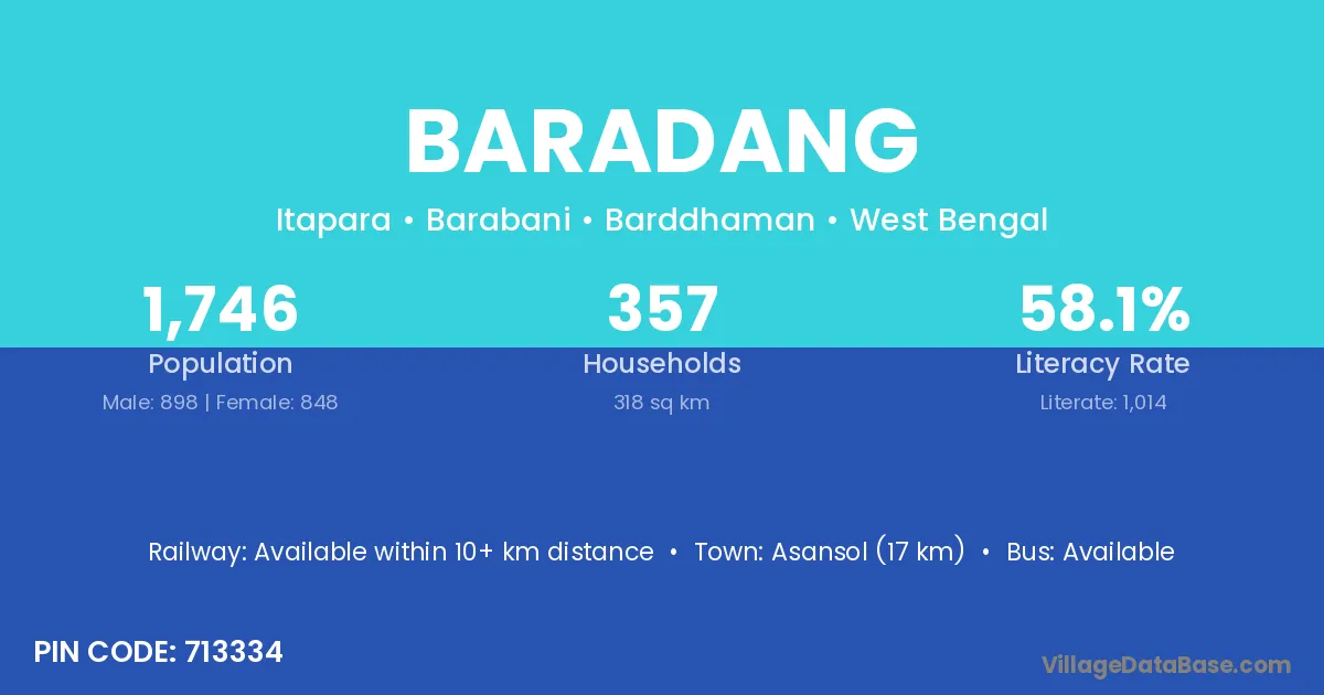 Asansol (17 km) is the nearest town to Baradang village for major economic activities and is located approximately 17 km away.