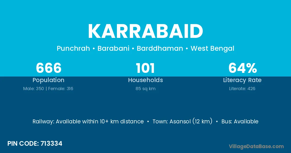 Asansol (12 km) is the nearest town to Karrabaid village for major economic activities and is located approximately 12 km away.