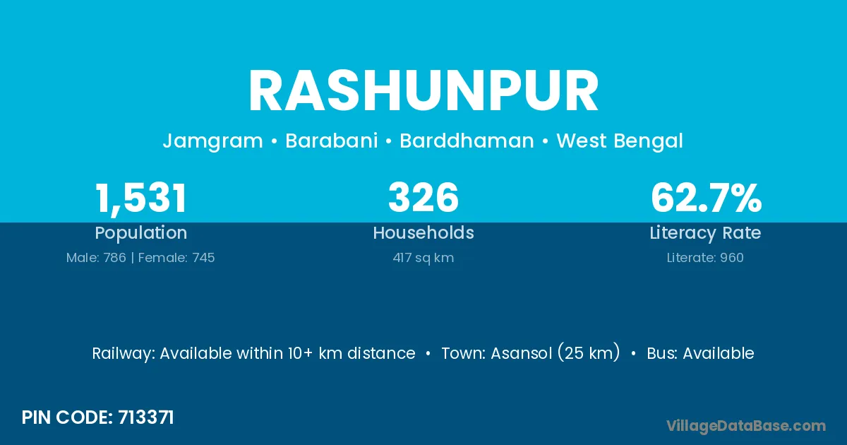 Asansol (25 km) is the nearest town to Rashunpur village for major economic activities and is located approximately 25 km away.