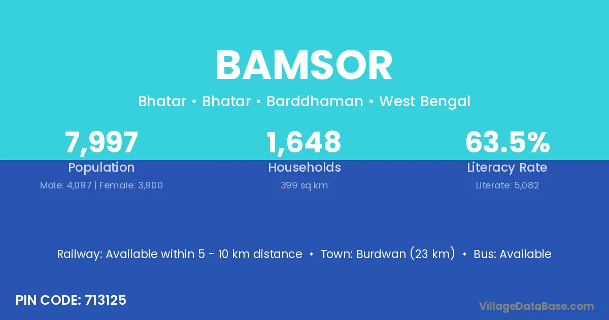Burdwan (23 km) is the nearest town to Bamsor village for major economic activities and is located approximately 23 km away.