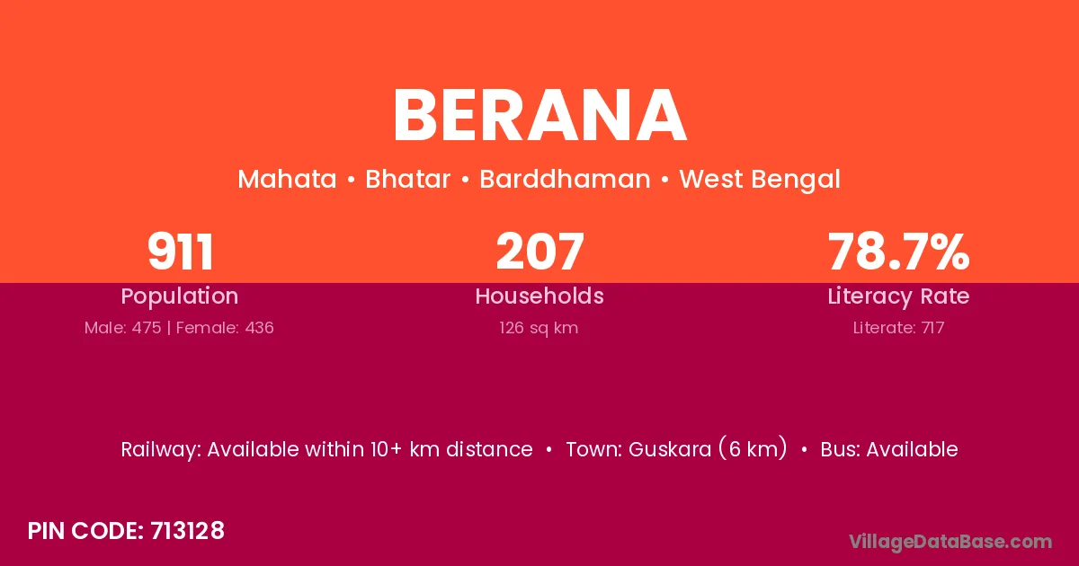 Guskara (6 km) is the nearest town to Berana village for major economic activities and is located approximately 6 km away.