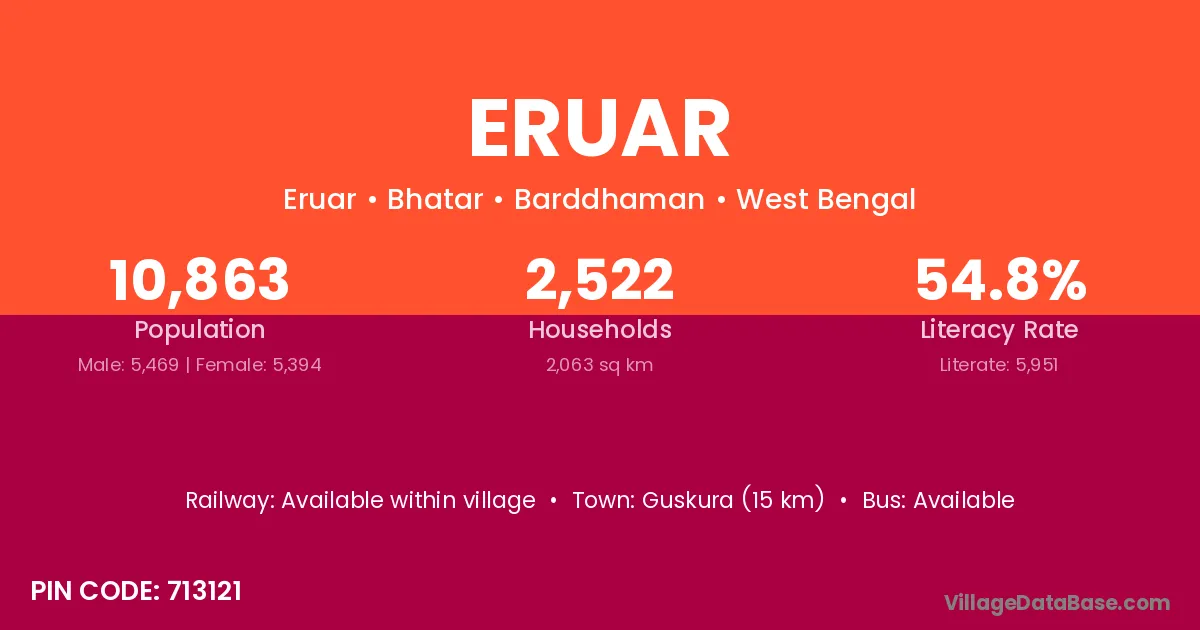 Eruar village has a total population of 10,863 people, of which 5,469 are males and 5,394 are females.