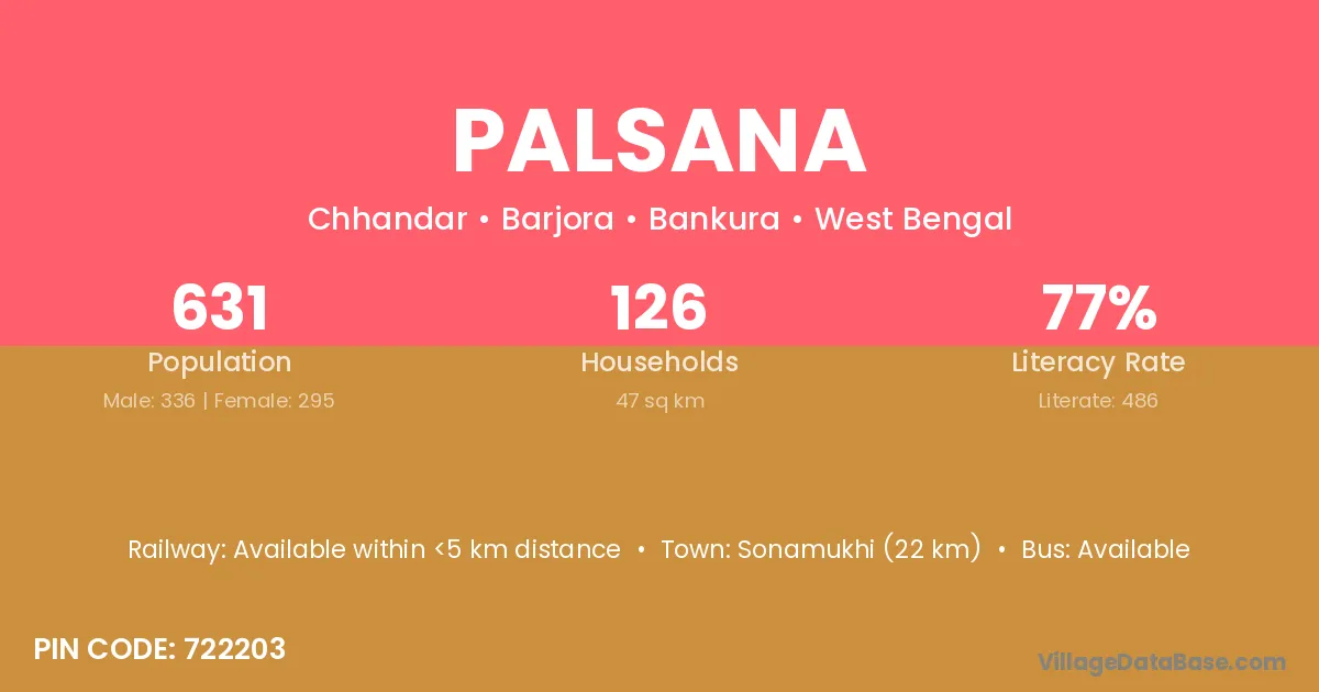 Bardhaman (30 km) is the nearest town to Palsana village for major economic activities and is located approximately 30 km away.