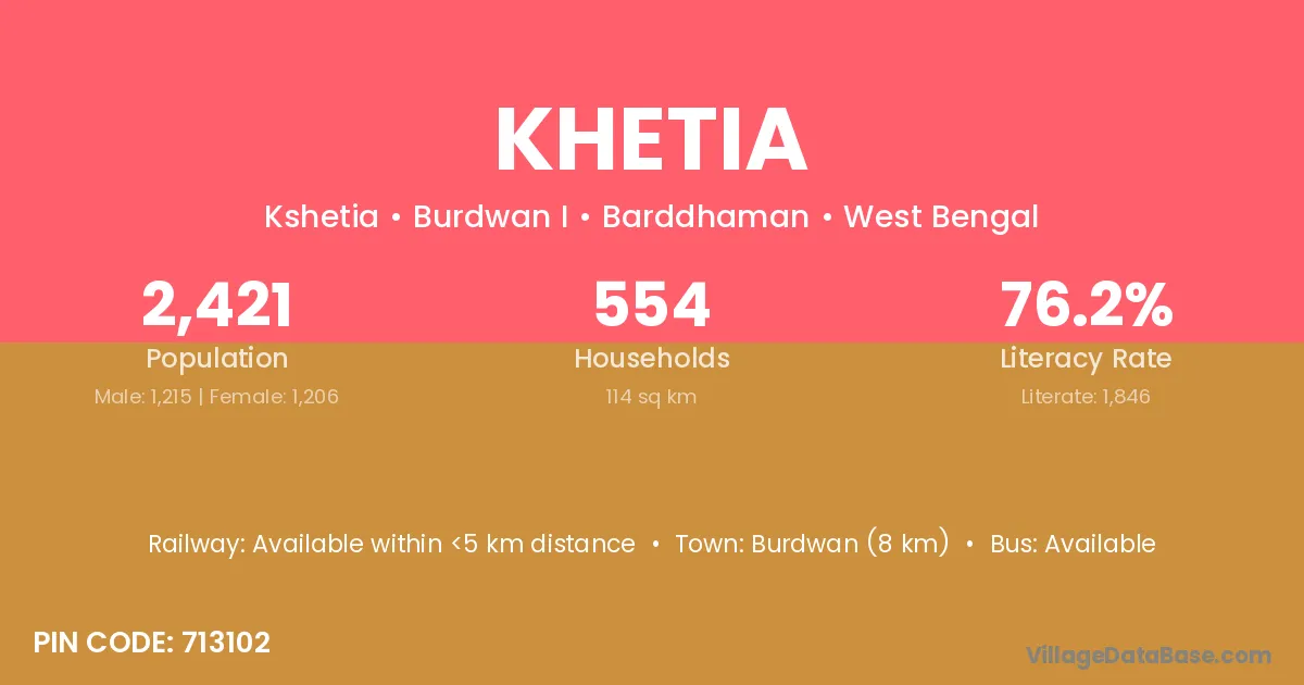 Burdwan (8 km) is the nearest town to Khetia village for major economic activities and is located approximately 8 km away.