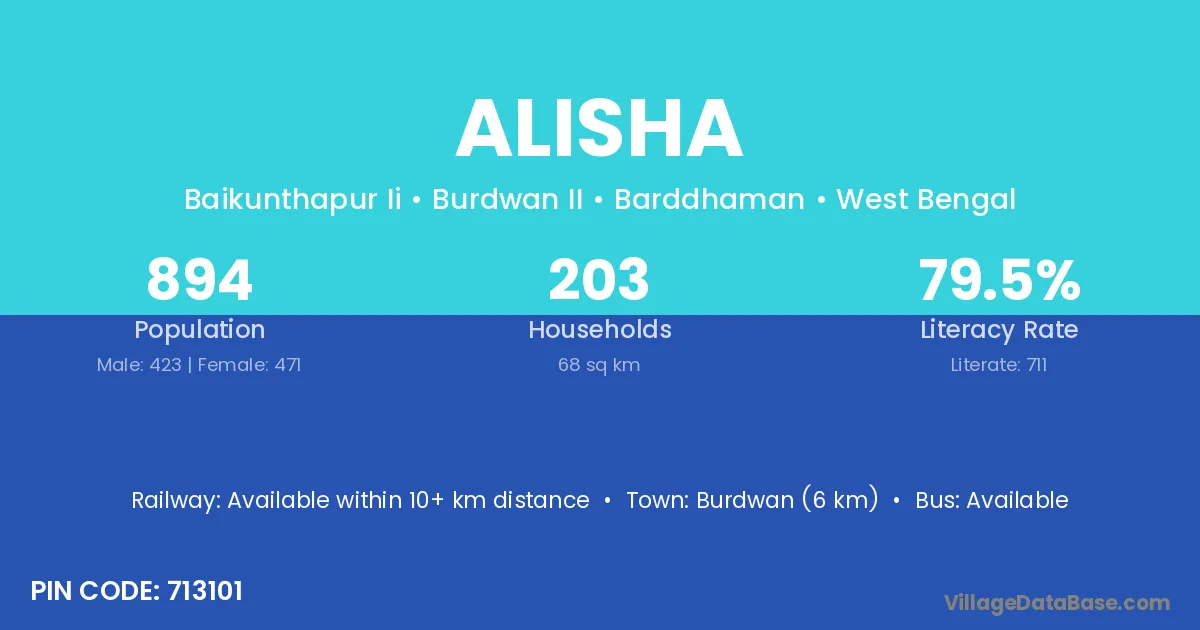 Burdwan (6 km) is the nearest town to Alisha village for major economic activities and is located approximately 6 km away.
