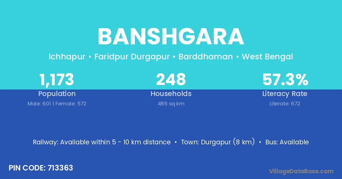 Durgapur (8 km) is the nearest town to Banshgara village for major economic activities and is located approximately 8 km away.