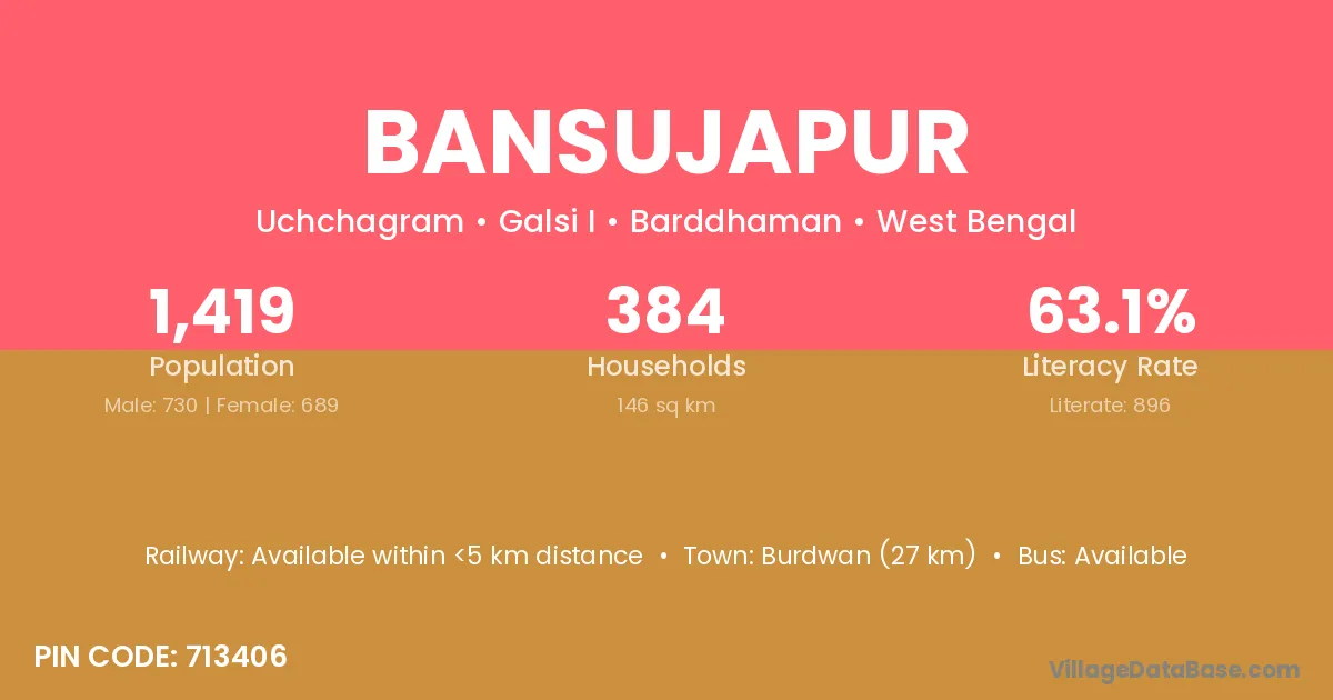 Burdwan (27 km) is the nearest town to Bansujapur village for major economic activities and is located approximately 27 km away.