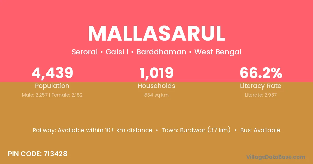 Burdwan (37 km) is the nearest town to Mallasarul village for major economic activities and is located approximately 37 km away.