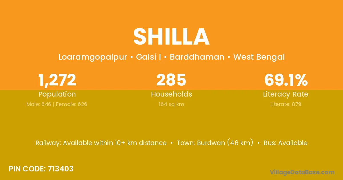 Burdwan (46 km) is the nearest town to Shilla village for major economic activities and is located approximately 46 km away.