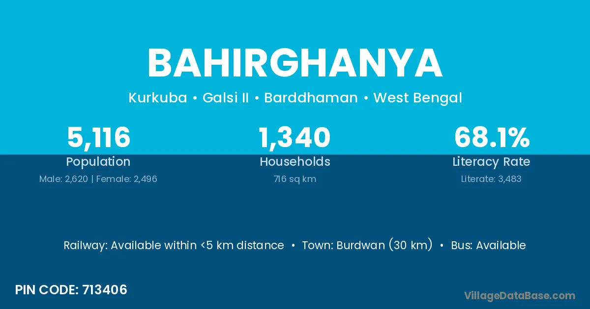Burdwan (30 km) is the nearest town to Bahirghanya village for major economic activities and is located approximately 30 km away.