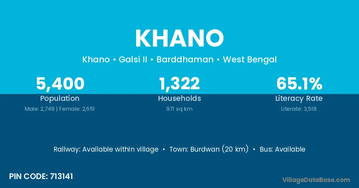 Burdwan (20 km) is the nearest town to Khano village for major economic activities and is located approximately 20 km away.