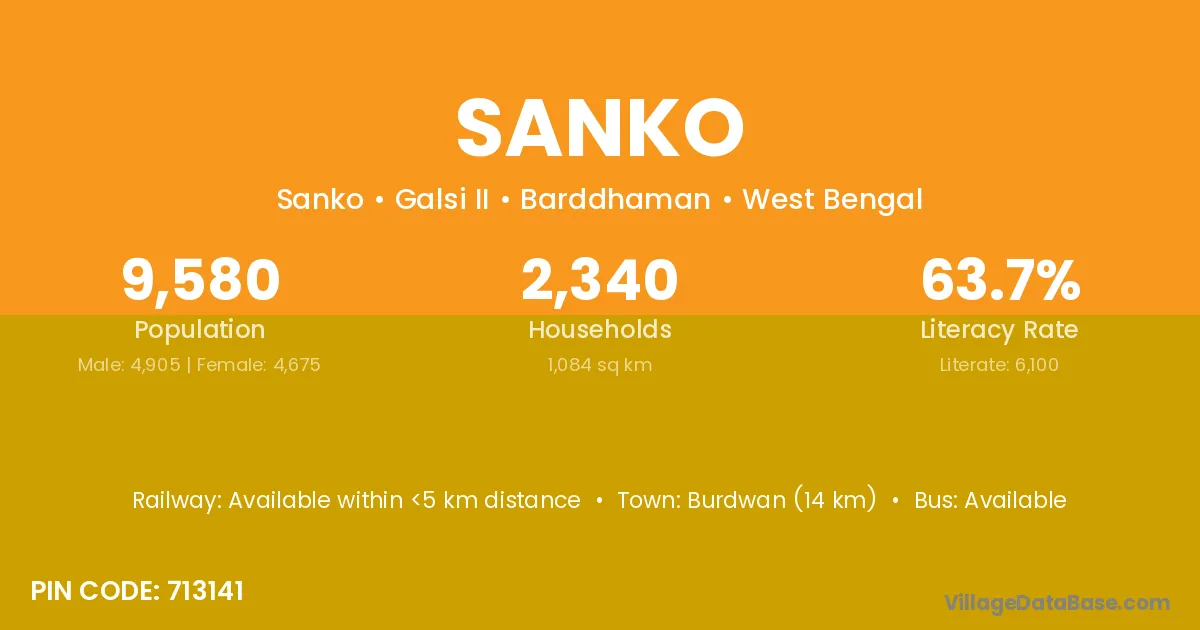 Burdwan (14 km) is the nearest town to Sanko village for major economic activities and is located approximately 14 km away.