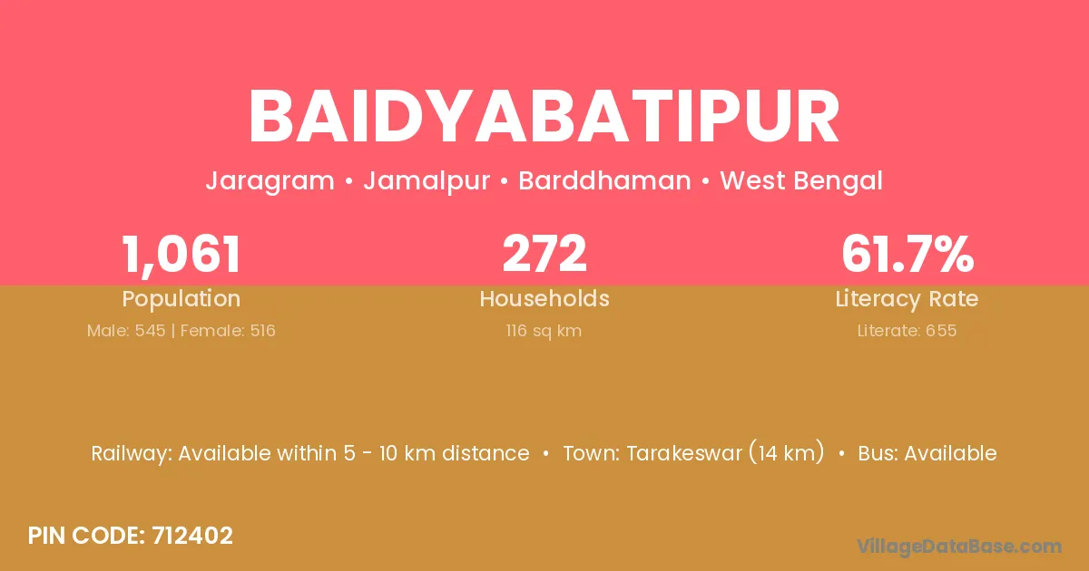 Tarakeswar (14 km) is the nearest town to Baidyabatipur village for major economic activities and is located approximately 14 km away.